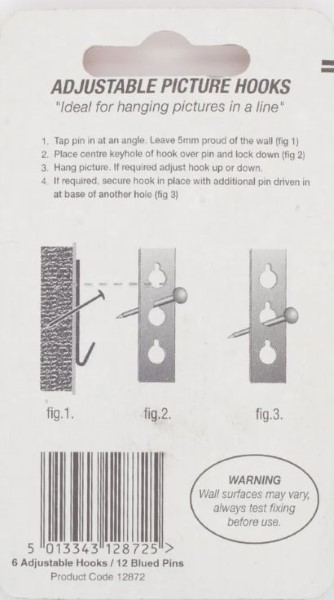 Adjustable Picture Hooks/Pins for Picture hanging. Steel material with a brass plated finish. Pack of 6.