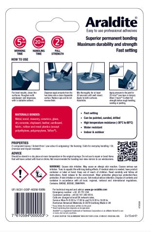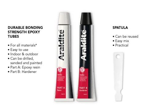 A strong, long-lasting solvent-free adhesive which is water-resistant and can be painted or sanded. Bonds metal, wood, masonry, ceramics, glass, dry concrete, chipboard, leather, cardboard, fabric, rubber and most plastics (except polyethylene , polypropylene , Teflon ). The 2-component epoxy is fast setting. Parts repositionable for 4 minutes. High temperature resistance (-30 C to 80 C). Oil, chemical and impact resistant.