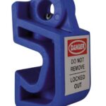 Mini Circuit Breaker Lockout in a blue finish and warning label. Easy to use by turning off the breaker & placing the lockout over the switch. Tightening the internal grub screw onto the switch locks the unit in place, a padlock can be fitted onto the hole in the lockout hasp therefore preventing access to the grub screw and therefore stops the switch from being operated until the padlock has been removed.