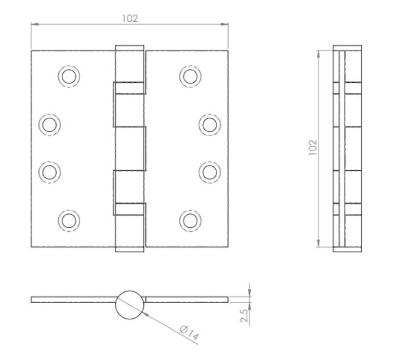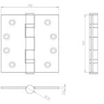 Fully certified high performance double ball bearing projection hinge. CE tested grade 13. 1/2 & 1hour fire tested. 1.5 PAIRS maximum weight 120kg door. 102 x 102mm. Thickness: 3mm. Use with 1mm Graphite based Intumescent (MANIPAD30) for FD30 or 2mm for FD60. Finish: Type 201 Satin Stainless Steel