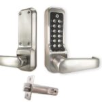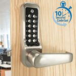 Borg heavy duty mechanical digital lock. Lever handle operation with clutch. Easi-code pro code change by special key (no need to remove from the door). With 60mm backset (84mm deep) anti-thrust tubular mortice latch – can also use a DIN Standard 8mm spindle anti-thrust nightlatch or sashlock (with separate deadbolt and Euro cylinder) or a Scandinavian Modular anti thrust nightlatch. Use recommended intumescent on mortice latches for fire doors. Passage mode function. Over 1000 combinations (not sequential). Reversible. Satin stainless steel.