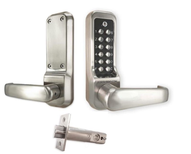 Borg heavy duty mechanical digital lock. Lever handle operation with clutch. Easi-code pro code change by special key (no need to remove from the door). With 60mm backset (84mm deep) anti-thrust tubular mortice latch – can also use a DIN Standard 8mm spindle anti-thrust nightlatch or sashlock (with separate deadbolt and Euro cylinder) or a Scandinavian Modular anti thrust nightlatch. Use recommended intumescent on mortice latches for fire doors. Passage mode function. Over 1000 combinations (not sequential). Reversible. Satin stainless steel.