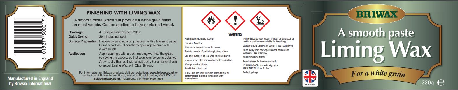A smooth white tinted paste wax, formulated to produce a white grained finish in open grained timbers. Particularly effective on oak and similar timbers. It is most effective when applied directly onto the bare wood giving the deep white colouring, but for an even effect it can be applied onto stained and sealed surfaces. Some woods will benefit from opening the grain with a wire brush. Liming Wax can be overcoated with Clear Briwax for a more durable finish.