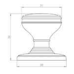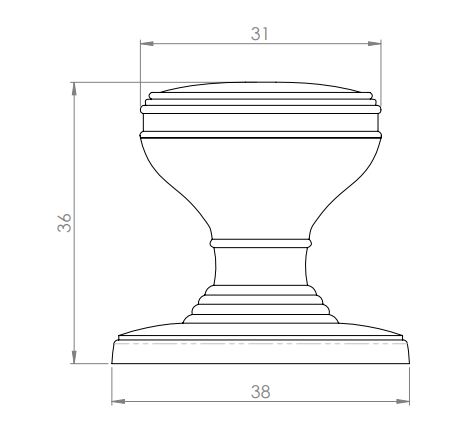 A plain topped knob with sweeping lines around the outer edge on a ringed tiered stem and rose.
