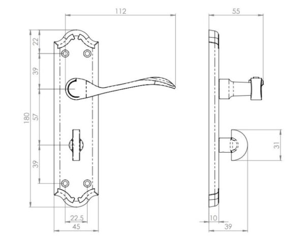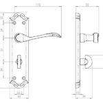 Madrid Lever on bathroom backplate. 180x45mm backplate. 57mm CC lever to 5mm spindle. Classically styled curved lever on a shaped backplate with detailing to both lever and backplate. Suitable for a more traditional doors. Comes with a 10 year mechanical guarantee and is Fire door rated.