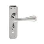 Eden Lever on bathroom backplate. A unique and distinctive geometric lever on a formed angular backplate. The shape of the lever itself is slim at the middle and chunky towards the end of the handle, allowing the user to grip it firmly when used. The angular cut backplate compliments the faceted diamond cut geometry of the handle. This is an ideal choice for use in many settings, such as at home or at shops and offices. Comes with a 10 year mechanical guarantee and is Fire door rated.