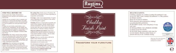 Rustins Quick Dry Chalky Finish Paint is designed to revive and give your furniture a new lease of life. Suitable for use on interior work, it contains wax and dries to a velvety flat matt finish. Very little preparation is required to receive the desired look as it can be painted over most previously coated items. If using over previously coated surface, test a small area for compatibility. Get the shabby chic look by painting your furniture with multiple coats then distressing it by lightly sanding down small areas using fine sandpaper or Rustins 0000 Steel Wool.