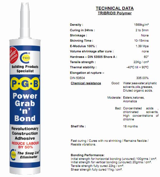 Power Grab n Bond is a revolutionary product in the field of heavy duty versatile bonding. Its formulation is based on our unique hybrid polymer product CT1. The density of Power Grab n Bond is far greater allowing phenomenal results in initial grab. Coupled with the rapid curing will in the majority of applications reduce labour time by at least 50%.