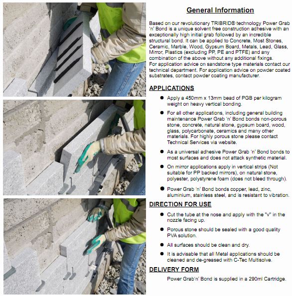 With Power Grab n Bond there is absolutely no need for any additional fixings as it was initially developed for façade bonding. In addition Power Grab n Bond has a capacity to adhere to endless materials such as stone, granite, marble, concrete, all metals (including alloys), polystyrene and most plastics. Power Grab n Bonds ability to bond combined materials such as wood to concrete or stainless steel to stone is incredible. As already outlined Power Grab n Bond was initially developed for façade applications, conventional methods relied on two component epoxy mix to adhere the marble or granite slab to the block wall. Depending on the weight of the slab each one would then have to be supported by drilling in ties to support each one. As with all epoxies they can be temperamental if the correct mix is not achieved. Also full cure can be between 24 and 72 hours.