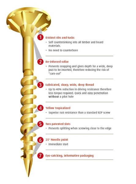 REISSER CUTTER Woodscrews represent the latest generation of technological excellence. They are uniquely designed to give ultimate performance and a perfect finish in all wood applications. The two patented slots (25mm and above) allow the screw to work closer to the edge without splitting, and the ribs and tucks under the head enable the screw to sit flush and tight without surface damage. The 20deg needle point gives the ability to penetrate almost all timbers without a pilot hole and the sharp, wide deep thread with unique lubrication gives up to 40% less driving resistance and easy penetration. The Yellow Tropicalized coating gives superior corrosion resistance (compared to a standard BZP coating) and the deep reinforced countersunk head recess allows the best possible fit to the driver bit, reducing cam out and providing extra strength at the critical junction between shank and head. Presented in eye-catching, informative packaging the CUTTER leads the way in premium High Performance Woodscrews.