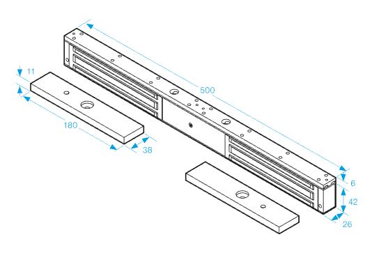Double door mini electro magnetic lock. Suface mounted unit. Fail unlocked. Holding force 272kg per door. Voltage 12V DC / 24V DC. Current 12V DC = 0.96A. 24V DC = 0.48A. 500x42x25mm CE/UKCA. FIRE TESTED TO BS EN 1634:1 FD30/60