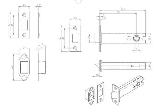 Heavy Duty Sprung Tubular Latch 103mm x 23mm. Backset 82mm.