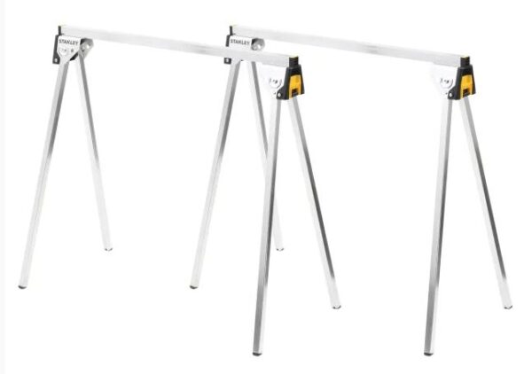 The Stanley Tools Essential Metal Sawhorse has an all-metal construction that allows use with clamps. They are easy to open and close, they fold down into a compact size and both of the sawhorses can also be clipped together, making them extremely easy to transport. Fitted with rubber feet that create friction on the surface during cutting, for added security and stability.
