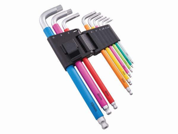 The Multicoloured Hex Key Set from Faithfull contains a selection of professional quality keys made with S2 steel which makes it highly resistant to impact. The keys are colour-coded to allow for easy size identification and are held together by a plastic clip with a twist and lock action to secure the keys into their slots.