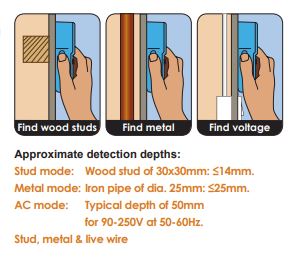 This Faithfull versatile advanced electronic detector helps avoid costly mistakes caused by drilling into concealed power cables, gas or water pipes and removes any guesswork when securing fixtures, hanging pictures or fitting shelving by pinpointing a solid base for fixing. The detector can be used to detect and locate wooded studwork, metal and AC voltage, providing a clear indication of concealed objects using the LED and buzzer indicator system. A marking groove is also provided at the top of the detector so that the surface can be marked prior to any drilling, nailing or screwdriving.
