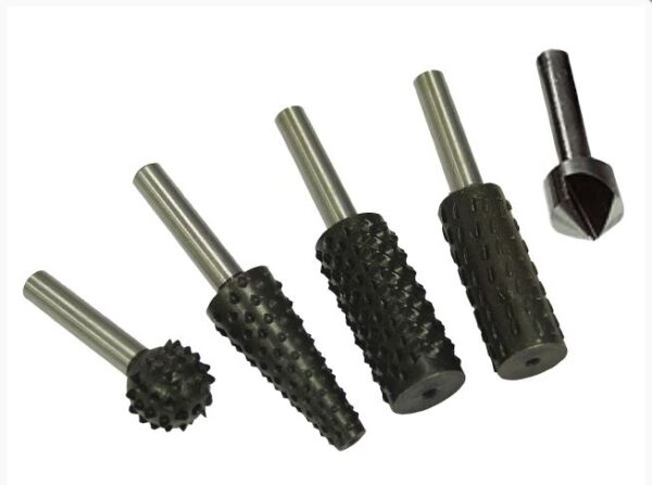 The Faithfull FAIRRSET5 5 piece set containing a cylindrical metal file, cylindrical, conical and ball shaped wood rasps and a countersink used in electric drills. This set can be used on metal work and wood applications for the professional and DIY user.
