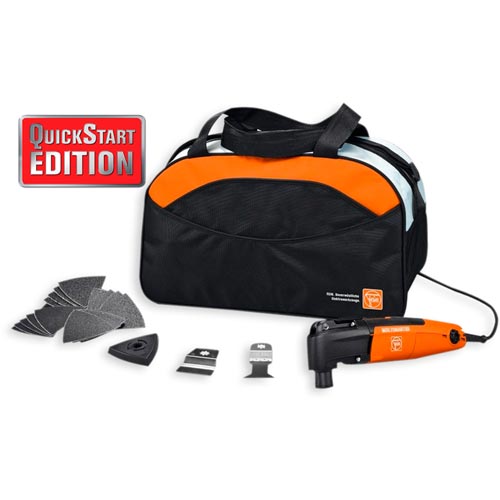 The QuickStart comes with sanding pad, 5 off 60, 80, 120 and 180 grit sanding sheets, rigid stopping knife, universal 44mm wide E-cut bi-metal saw blade, all supplied in Fein carry bag.