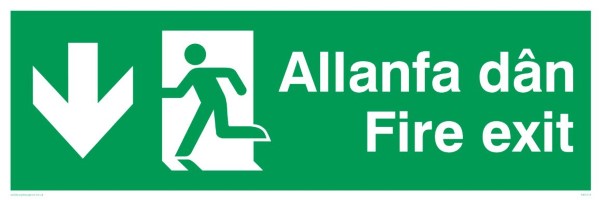 Bi-lingual – welsh / english with running man symbol facing left and arrow pointing down.