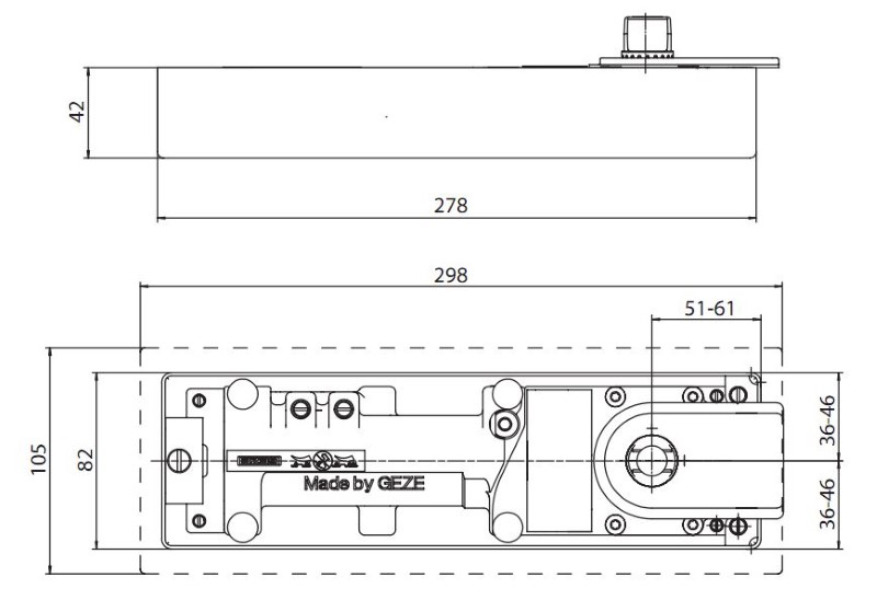 @GEZE TS 500N DOUBLE/SINGLE ACTION FLOOR SPRING MECHANISM ONLY. FIXED SIZE 3, ADJUSTABLE CLOSING SPEED, FIXED BACKCHECK AND FIXED LATCH ACTION SUITABLE FOR INTERNAL DOORS UP TO 950mm WIDE AND 100kgs. SUITABLE FOR FIRE DOORS. WITH CEMENT BOX BUT WITHOUT COVERPLATE, STRAP, PIVOT OR TOP CENTRE.