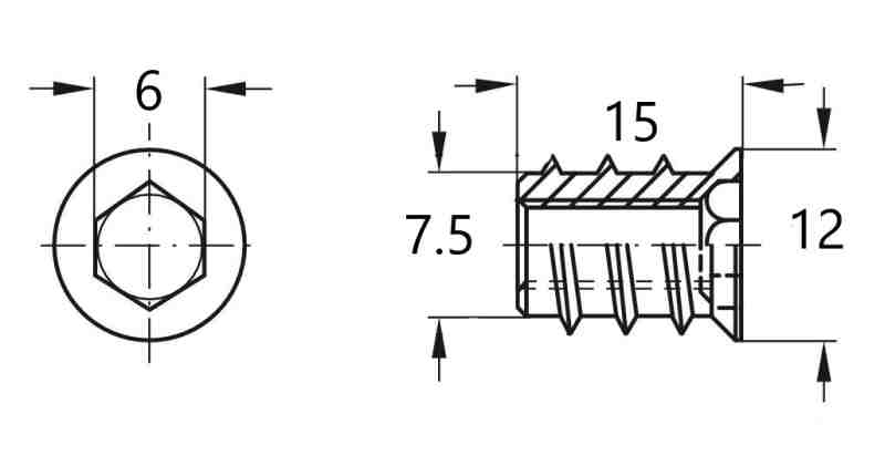 Screw-in sleeve, M6 internal thread, hexagonal socket head, zinc-plated steel. Internal thread: M6, Socket size: SW6, Length: 15 mm
