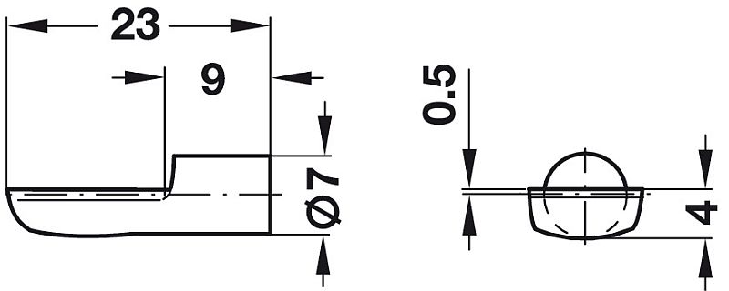 Shelf Support, plug in, for wooden shelves and 7mm diam holes, or 7.5 mm drill hole (with sleeve). Spoon shaped. Nickel plated.