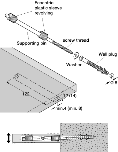 Level the shelf by laying on the shelf supports and adjusting the eccentric screws before finally fixing the shelf in position