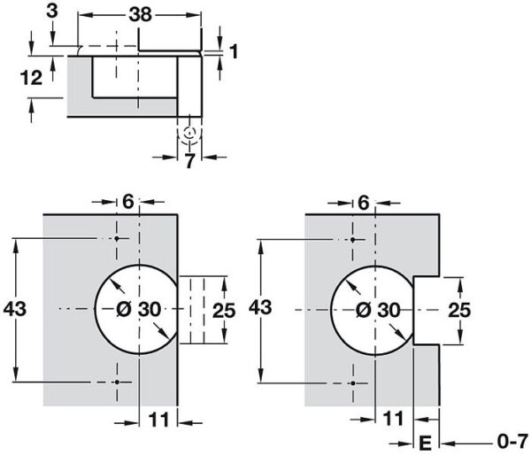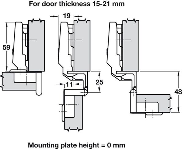 NEXIS 270deg hinge with exposed axle, Diam: 30 mm cup, screw fixing, slide on arms. 0 crank, screw fixing slide on system for door thickness 14 – 21 mm