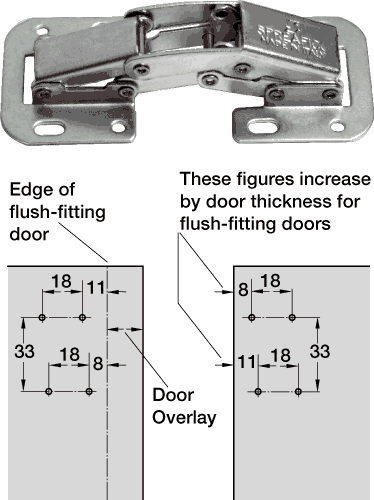 To hinge one overlay door, side or centre panel mounted or one inset door, side panel mounted