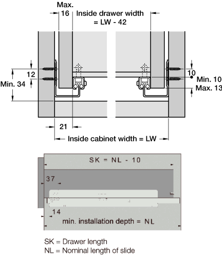 Concealed dynamic drawer runners, single extension, 30 kg capacity, with intergrated Self-close. Self close, Length (NL) 350 mm, Drawer length (SK) 340 mm