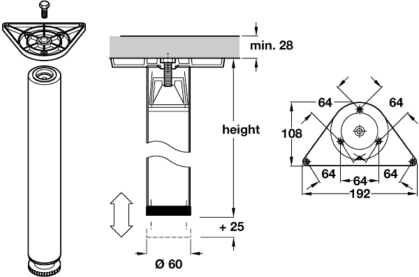 Table leg, 690 mm high,Diam: 60 mm. For supporting worktops, table tops or desks