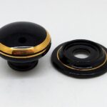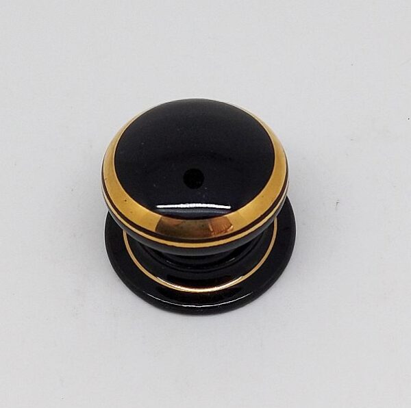 Porcelain wardrobe knob in Gold Line Black. Approximately 38mm diameter, 32mm high (with rose), 26mm high (without rose). Can be used with or without the rose.