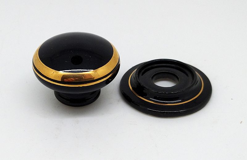Porcelain wardrobe knob in Gold Line Black. Approximately 38mm diameter, 32mm high (with rose), 26mm high (without rose). Can be used with or without the rose.