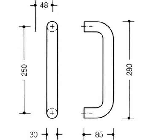 Straight handle in a curved shape, with straight supports, for mounting on leaf doors, in conjunction with BA5.0 for frame doors.