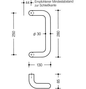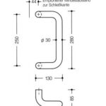 HEWI System 111 Pull Handle is an L-shaped handle in curved shape, with straight support, prepared for mounting on flush doors, centre-to-centre 250mm, made of through-dyed polyamide, Diameter 30mm, for one-sided and paired (double-sided) fixing on glass, wooden, PVC and metal doors (aluminium: 1 to 3 chamber, steel: 1 chamber profiles)