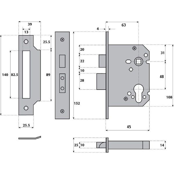 Case pierced to accept 20mm and 38mm centre bolt through fixing escutcheons. Pierced to accept 38mm centre horizontally and diagonally opposed bolt through fixing furniture