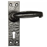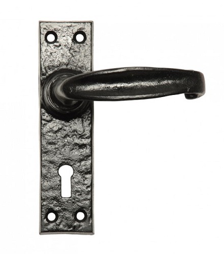 Black antique malleable iron lever handle with bathroom/privacy fitting. Spring loaded. Two coat protective finish. Bathroom, latch and lock options available (lock version shown). Also available in pewter and argent finish.