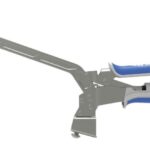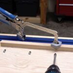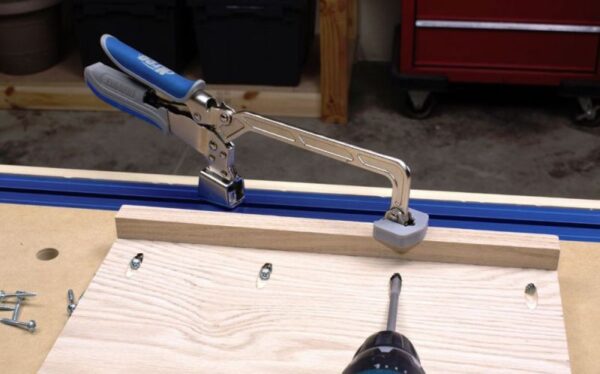 Quick, Easy Benchtop Clamping with Automatic Adjustment. 6in reach (152mm). Clamps materials up to 5in thick (127mm). Adjusts automatically to match material thickness. Easy-to-regulate pressure with a simple thumbscrew. Large clamp faces spread pressure evenly. Ergonomic padded grips prevent hand fatigue. Compatible with the Kreg Clamp Table, Clamp Trak, Clamp Plate, and the Universal Clamp Trak Kits