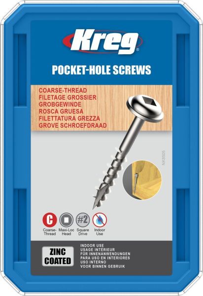 High quality pocket-hole screws for use in softwoods and plywood, on a wide variety of interior projects. Designed to sit flush in the bottom of the pocket, eliminating pull through. Use with Kreg jigs.