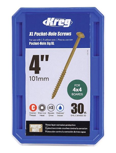 XL Pocket-Hole Screws are optimized for use with the Kreg Pocket-Hole Jig® XL, the Kreg Jig HD and 1.1/2in and larger stock. These large 2.1/2in-long No14 hardened-steel screws provide incredible shear-resistance, and have a Protec-Kote finish with three anti-corrosion layers for long-term moisture resistance. No3 square driver.