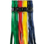 Coloured lanyards featuring a metal spring clip front attachment and a intermediate short release clip to easily remove keys.