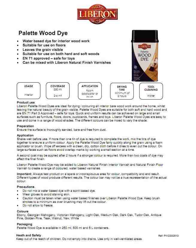 Liberon Palette Wood Dyes are ideal for dying / colouring all interior bare wood work around the home, whilst leaving the natural beauty of the grain visible. Water based, Palette Wood Dyes are suitable for both soft and hard wood and are EN 71 Part 3 Approved ย safe for toys. Quick and uniform results can be achieved on large and small surfaces such as furniture, floors, doors, cupboards, frames and toys. Liberon Palette Wood Dyes are easy to use and come in a range of wood shades. The different colours can be mixed to vary the shade.