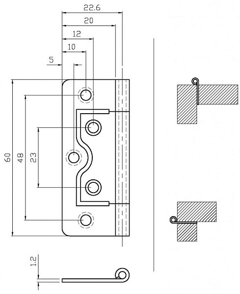 Standard Pattern Flush Furniture Hinge. 5 hole. 60mm.