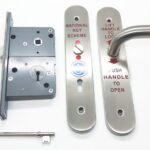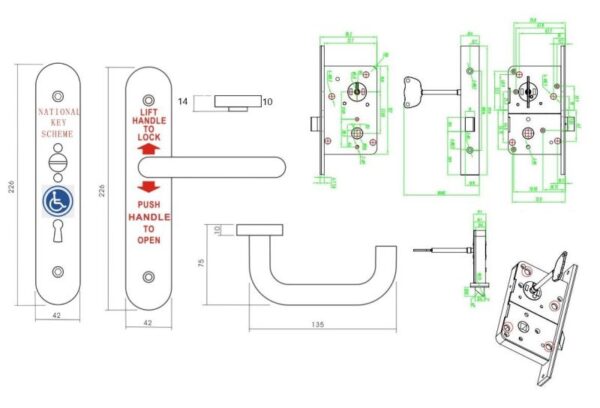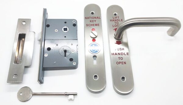 From the RADAR Key scheme, a complete lockset comprising a 6 lever Mortice lock and engraved furniture, incorporating an external indicator and emergency coin release. All locksets are supplied with 1x bow shaped handle key and fixings.