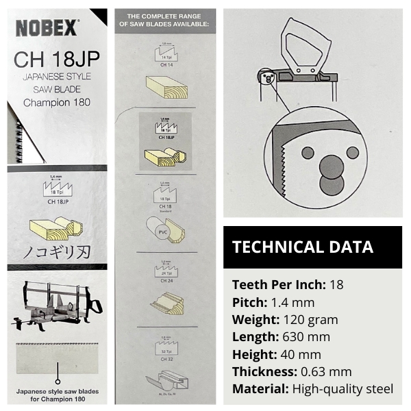 Japanese Style Mitre Saw Blades for Nobex Champion 180 are made of top-quality steel. The Japanese Style Impulse Hardening is 3-edge ground, has a unique close tolerance and superior performance in all kinds of wood. Extremely fast-cutting with retianed accuracy. 4-5 times longer life than standard blades. You can work up to 5 times faster and with more precision.
