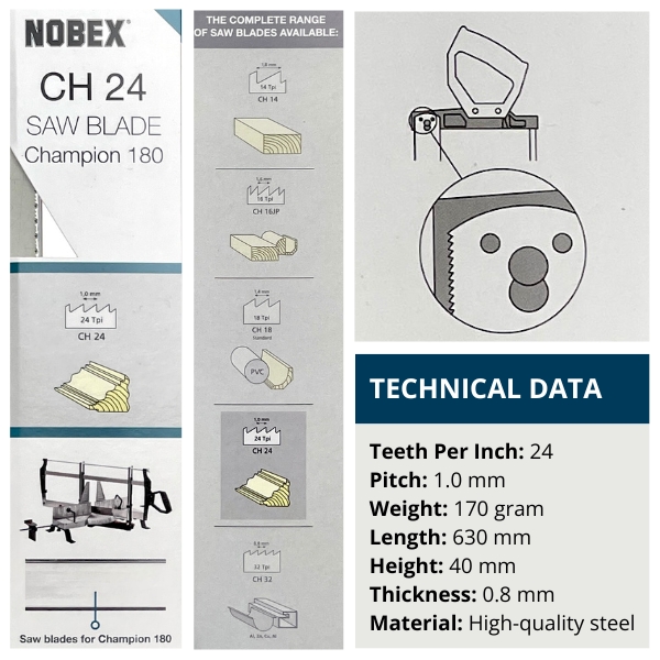 Nobex Blade for 180 Champion mitre saw, long-life replacement blades are made of high-quality steel. With hard point teeth for maximum life and ideal for fast wood cutting.