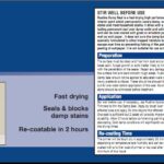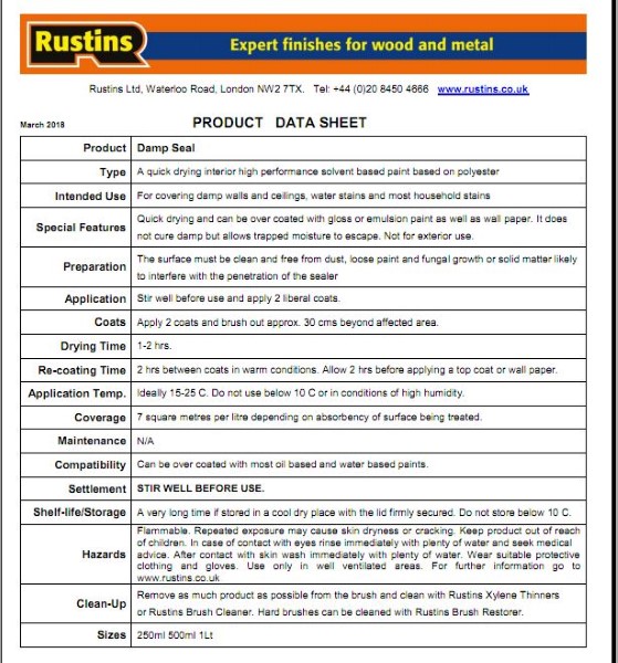 Rustins Damp Seal is a fast drying high performance interior paint which permanently covers damp, water stains and most household stains. It dries with a long lasting permanent seal over damp walls and ceilings and can be over coated with gloss or emulsion paint as well as wallpaper. It does not cure the damp but is specially formulated to allow trapped moisture to escape over time so preventing flaking of the paint or peeling of wallpaper.