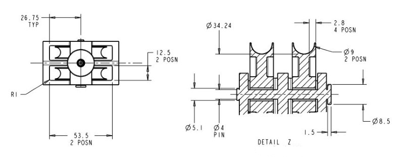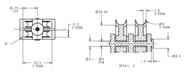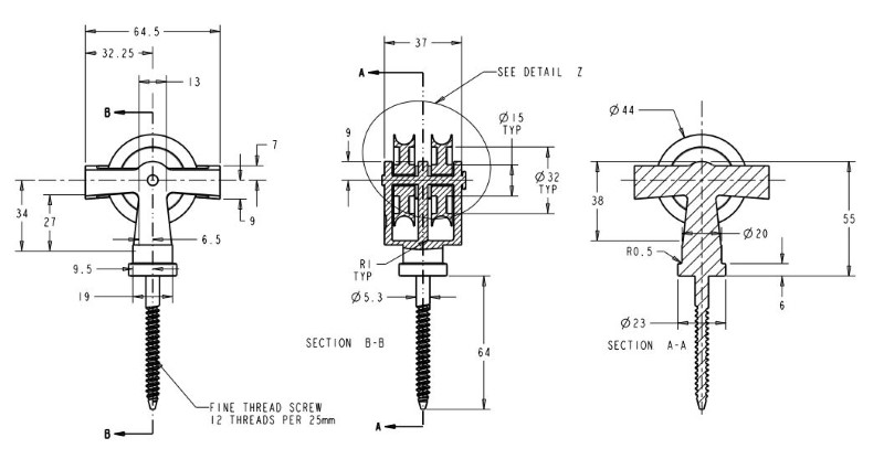 Screw Fixed Cast Double Pulley. 44mm Nylon Wheels