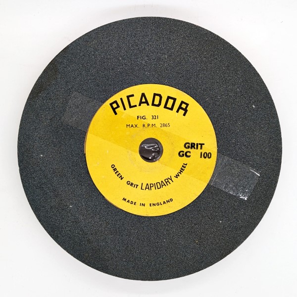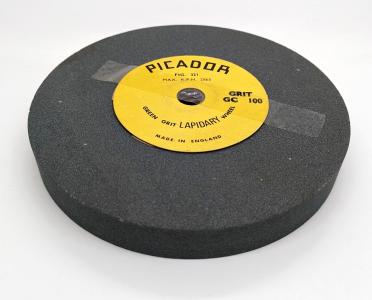 Green grit lapidary wheel. 8in x 1in x 5/8in. 200x25x16mm.100 grit. Max speed 2865 RPM.