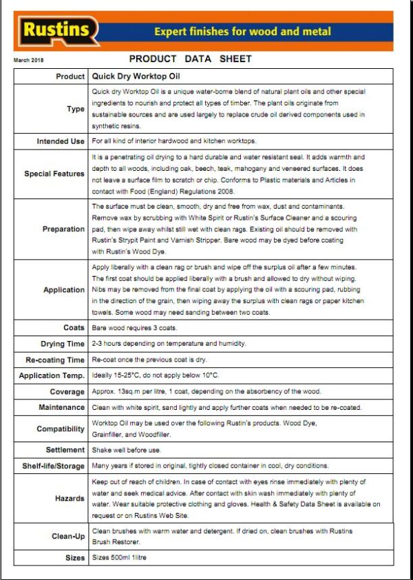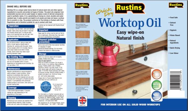 Rustins Worktop Oil is a unique water-borne blend of natural plant oils and other special ingredients which nourishes and protects all types of timber. It is a quick-drying wooden work surface treatment, leaving a durable and water-resistant seal which is not vulnerable to scratching or chipping. Rustins Worktop Oil is solvent free and conforms to the UK Articles in Contact with Food Regulations and is suitable for the kitchen or in any other food-related environment. Plant oils used in its formulation originate from sustainable sources. One litre will cover around 13 square metres per coat depending on the absorbency of the wood. Size: 500ml