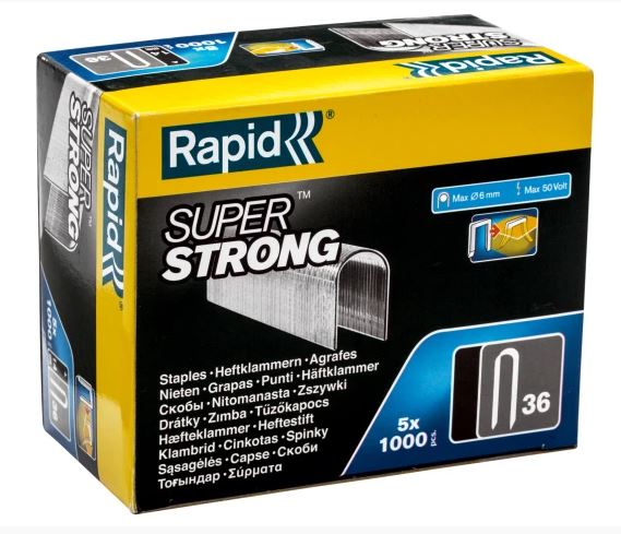 Rapid No. 36 precision cut, high-performance steel flat wire cable staples with rounded crown designed for securing low voltage cables up to a maximum of 6mm in diameter. The staples are made from strong galvanised wire with diverging points (DP), which makes the leg points go in opposite directions for extra strong bonding.